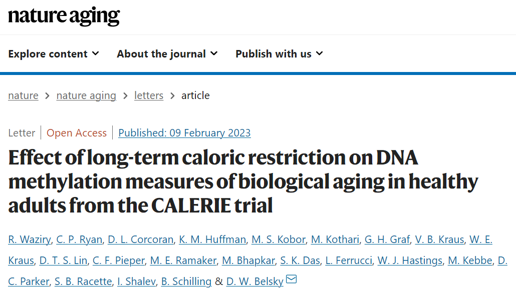 2023年2月9日,哥伦比亚大学和北卡罗莱纳大学教堂山分校的研究人员在 Nature 子刊 Nature Aging 发表了题为:Effect of long-term caloric restriction on DNA methylation measures of biological aging in healthy adults from the CALERIE trial 的研究论文。