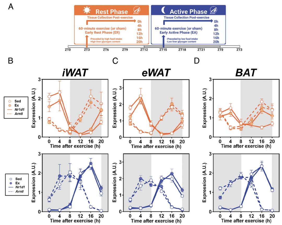 为了回答上述问题,研究者首先测量了小鼠腹股沟(iWAT)和附睾(eWAT)白色脂肪组织以及肩胛棕色脂肪组织(BAT)中的核心时钟基因Arntl和反相对应基因Nr1d1的表达,来确定时间和锻炼对脂肪组织中外周生物钟的影响。