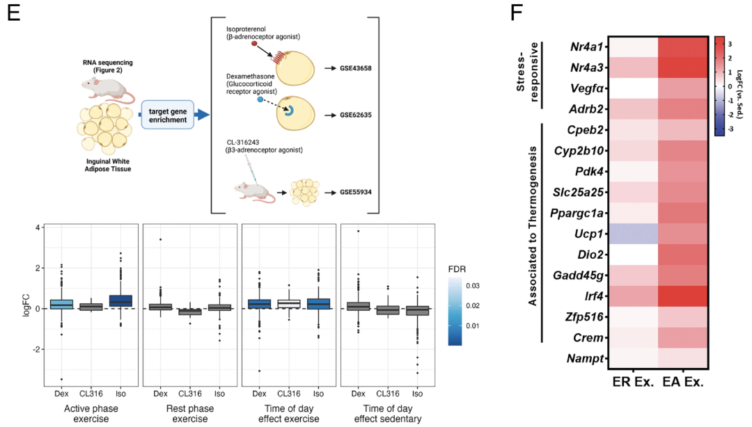 与久坐不动的个体相比,在“晨练”的情况下有121个转录物发生了变化,其中大多数基因为特异性上调。比如:与脂肪组织褐变和发热相关的Cpeb2、Cyp2b10、Pdk4、Slc25a25等基因,以及调节压力或糖皮质激素刺激物的基因Nr4a1, Nr4a3, Vegfα和Adrb2。而“晚练”小鼠的体内,却没有发现转录物的差异性表达。