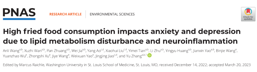 [1] Wang A, Wan X, Zhuang P, Jia W, Ao Y, Liu X, Tian Y, Zhu L, Huang Y, Yao J, Wang B, Wu Y, Xu Z, Wang J, Yao W, Jiao J, Zhang Y. High fried food consumption impacts anxiety and depression due to lipid metabolism disturbance and neuroinflammation. Proc Natl Acad Sci U S A. 2023 May 2;120(18):e2221097120. doi: 10.1073/pnas.2221097120.