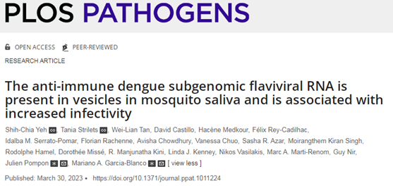 [1]Yeh SC, Strilets T, Tan WL, et al. The anti-immune dengue subgenomic flaviviral RNA is present in vesicles in mosquito saliva and is associated with increased infectivity. PLoS Pathog. 2023 Mar 30;19(3):e1011224. doi: 10.1371/journal.ppat.1011224.