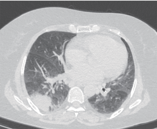 「在我们本地医院看了下一直没好,这两天有点喘不上气。听说咱这医院大,就再来看看。」患者拿出了在外院拍的片子,CT 显示双侧肺部炎症,可见支气管充气相,少量胸腔积液。主任做了个听诊,简单开了些检查,便让他下午来办住院。