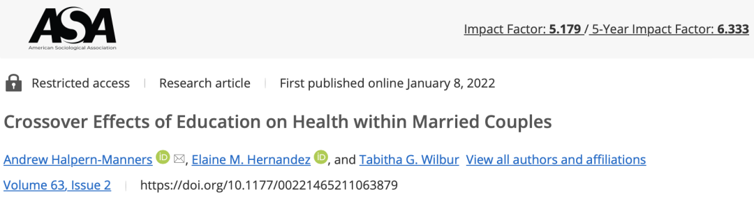 [1]Halpern-Manners A, Hernandez EM, Wilbur TG. Crossover Effects of Education on Health within Married Couples. J Health Soc Behav. 2022 Jun;63(2):301-318. doi: 10.1177/00221465211063879. Epub 2022 Jan 8. PMID: 35001695.