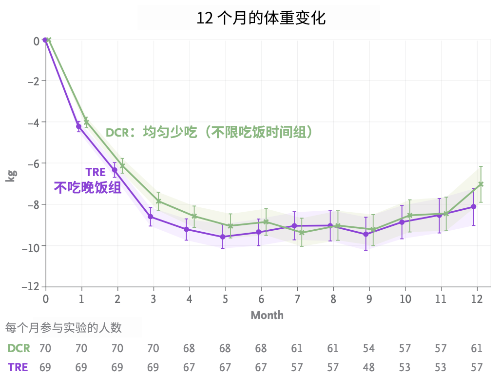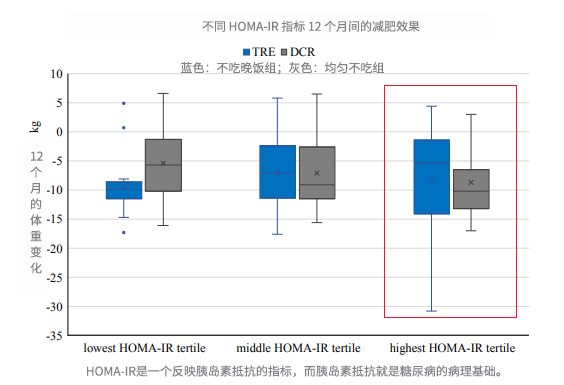 在胰岛素抵抗最严重(但还没到确诊糖尿病的级别)的人当中,不吃晚饭减肥的人,瘦下来大约是 5 公斤,而正常吃饭(均匀少吃)的人瘦下来大约是 10 公斤。