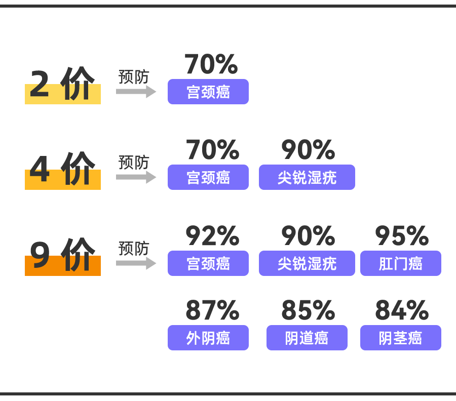 9 价 HPV 疫苗可以预防:7 种高危型 + 2 种低危型,除了能预防 92% 的宫颈癌,还能预防其他多种癌。