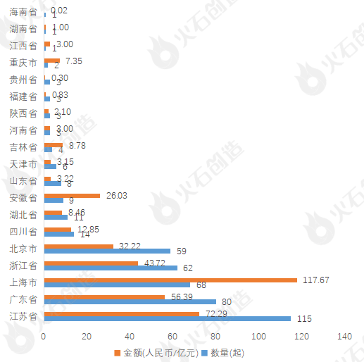 【融资地域分布】上半年融资项目主要分布在江苏省(115起)和广东省(80起)。从融资金额来看,上海市最为突出,融资金额高达117.67亿元,占总融资金额的29.24%;其次,江苏省也较为突出,融资金额高达72.29亿元,占总融资金额的17.97%。