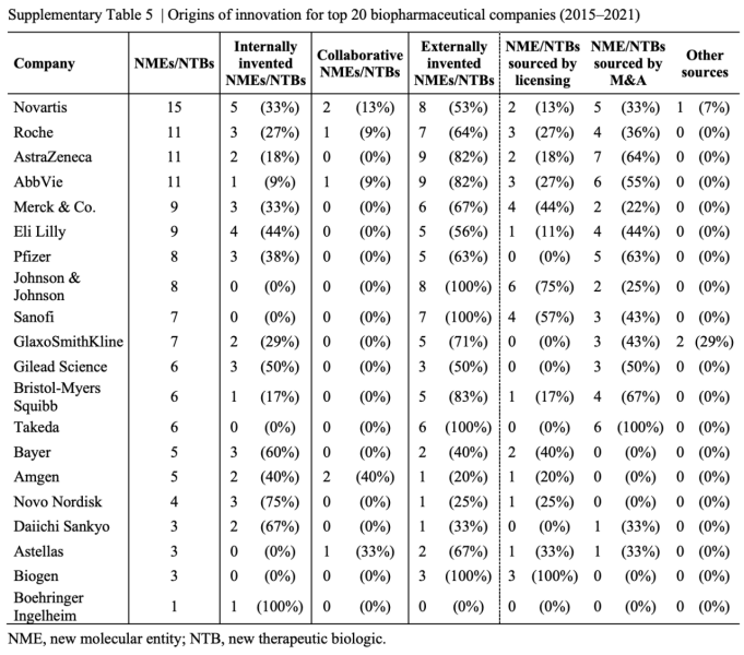 近日,Nature统计了2015年1月1日至2021年12月31日期间,FDA批准的前20家制药公司药物来源。其中,只有28%是由MNC内部研发部门开发,这些内部研发部门总体上更关注小分子药物。Biotech是TOP20药企主要创新来源,占新药总数的47%。