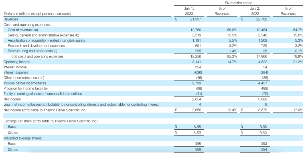 其中,生命科学业务部门上半年营收 50.8亿美元(363亿人民币),收入占比 23.7%,同比下降32.4% 。营业利润为16.6亿美元(118.6亿人民币)。