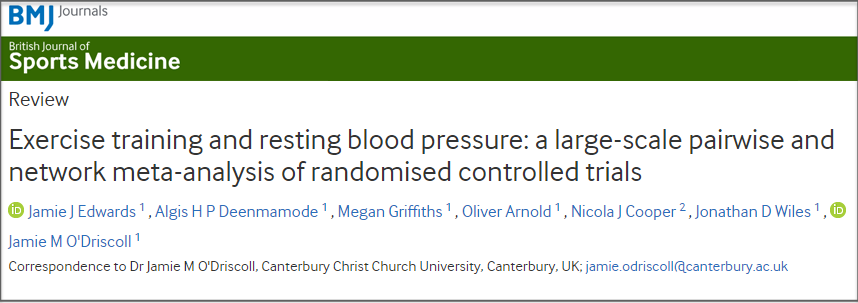 ② Edwards JJ, Deenmamode AHP, Griffiths M, Arnold O, Cooper NJ, Wiles JD, O'Driscoll JM. Exercise training and resting blood pressure: a large-scale pairwise and network meta-analysis of randomised controlled trials. Br J Sports Med. 2023 Jul 25:bjsports-2022-106503. doi: 10.1136/bjsports-2022-106503.