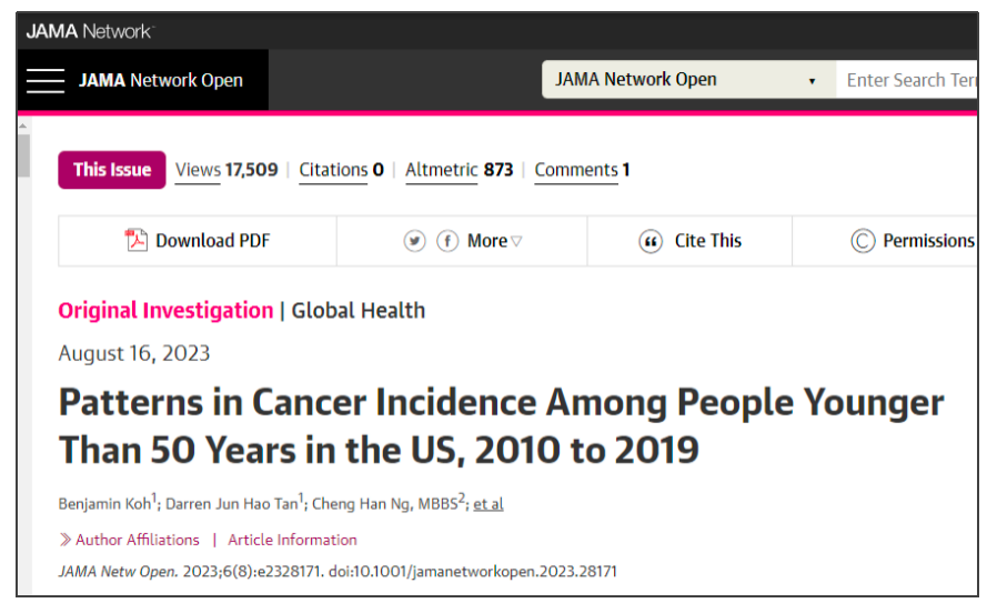 ① Benjamin Koh,et al.,(2023). Patterns in Cancer Incidence Among People Younger Than 50 Years in the US, 2010 to 2019. JAMA Netw Open,DOI: 10.1001/jamanetworkopen.2023.28171.