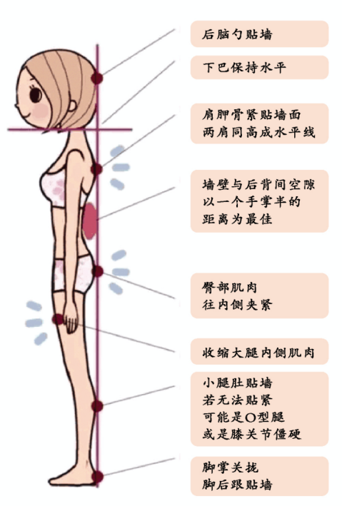 2. 小腿肚紧贴墙壁,若无法贴紧墙壁,可能有O型腿或者膝关节僵硬的问题。