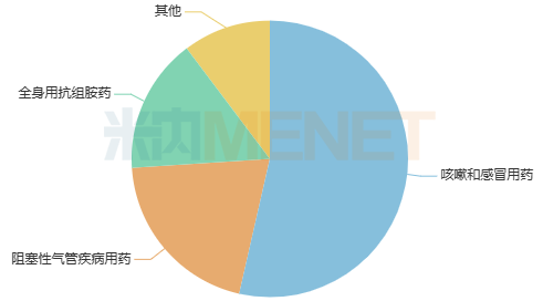 呼吸系统化药(含生物药)在2022年实体药店销售规模突破100亿元大关后,2023年上半年同比增长超过20%。从亚类来看,咳嗽和感冒用药市场份额最大,超过50%,阻塞性气管疾病用药和全身用抗组胺药则分别位居第二、三位。
