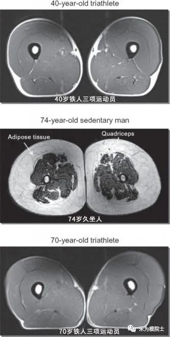 美国运动科学院院士、美国伊利诺伊大学博士生导师朱为模教授2021年刊文介绍,上中下三张照片分别为40岁铁人三项运动员、74岁久坐人、70岁铁人三项运动员大腿肌肉横断扫描图。
