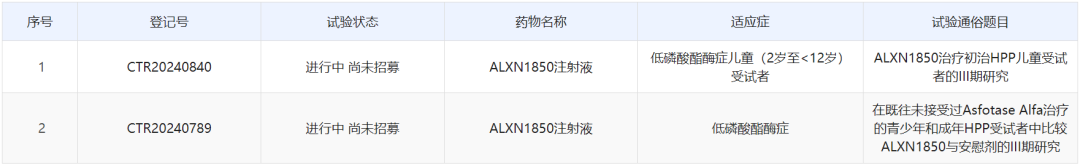 中国药物临床试验登记与信息公示平台官网近日公示,阿斯利康(AstraZeneca)已经在中国启动了两项ALXN1850注射液的国际多中心(含中国)3期临床研究,分别用于治疗2~12岁低磷酸酯酶症儿童受试者、≥12岁的青少年和成人低磷酸酯酶症受试者。根据阿斯利康公开资料,ALXN1850(重组碱性磷酸酶)是正在研发中的新一代组织非特异性碱性磷酸酶酶替代疗法(ERT)。