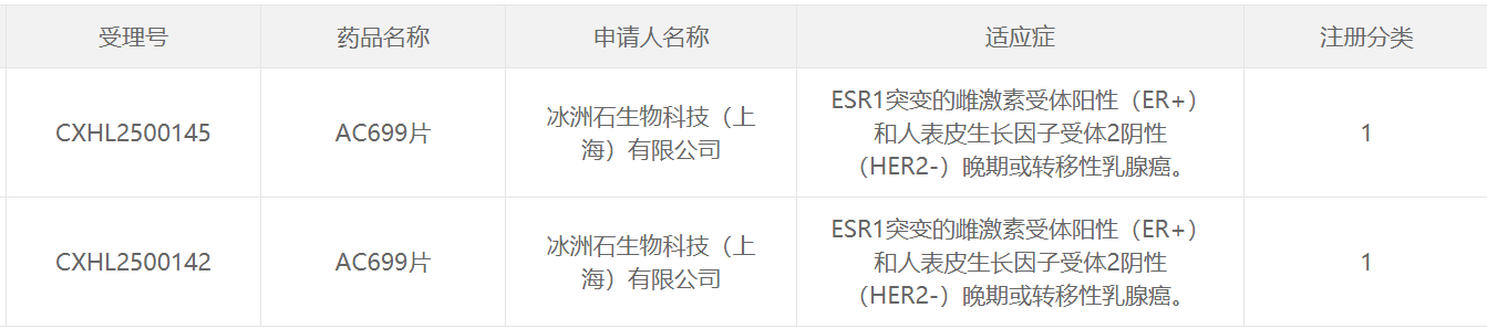 2024年8月,冰洲石生物宣布AC699获FDA授予快速通道资格,用于ER阳性、HER2阴性、ESR1突变的晚期或转移性乳腺癌,这些患者在至少1种内分泌基础治疗中或之后疾病进展。