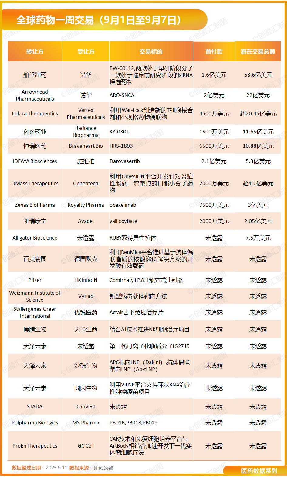据创鉴汇不完全统计,上周(9月1日至9月7日)全球生物医药领域共披露21起交易事件,潜在交易总额超133亿美元,其中5笔交易突破10亿美元大关。交易标的集中在前沿技术平台(如LNP递送、共价生物制剂平台等),以及处于不同研发阶段的创新疗法(涵盖RNAi、抗体偶联药物、小分子药物等)。