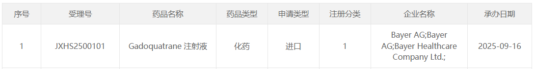 9 月 16 日,CDE 官网显示,拜耳 1 类新药 Gadoquatrane 注射液在国内申报上市。根据该药的临床研究进度,Insight 数据库推测本次申报适应症为用于核磁共振成像。