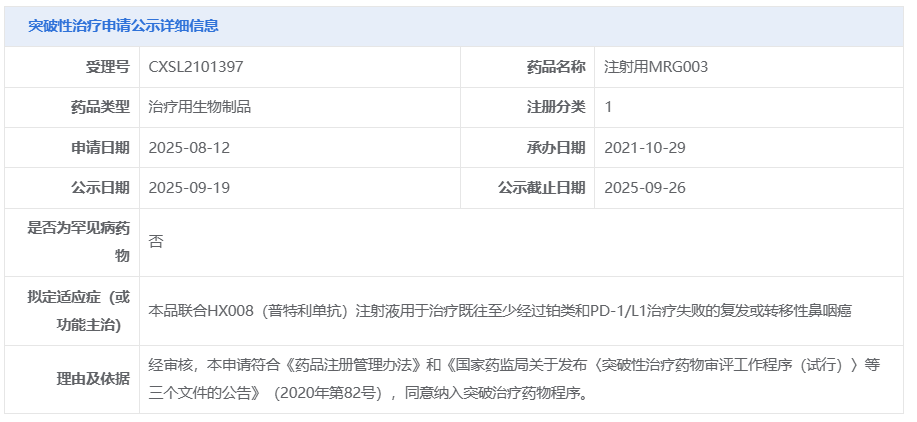 9 月 19 日,CDE 官网显示,乐普生物的 MRG003 的拟被纳入突破性治疗,适应症为 MRG003 联合普特利单抗(PD-1单抗)用于治疗既往至少经过铂类和 PD-1/L1 治疗失败的复发或转移性鼻咽癌。