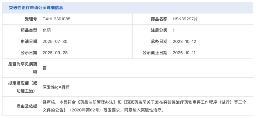 9 月 28 日,CDE 官网显示,海思科 HSK39297 片拟纳入突破性治疗品种,用于治疗原发性 lgA 肾病。