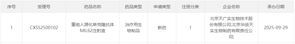 9 月 29 日,CDE 官网显示,天广实重组人源化单克隆抗体 MIL62 注射液新适应症的新药上市许可申请已获受理。根据公开资料和临床试验进展,Insight 数据库推测该适应症为治疗原发性膜性肾病(PMN)。