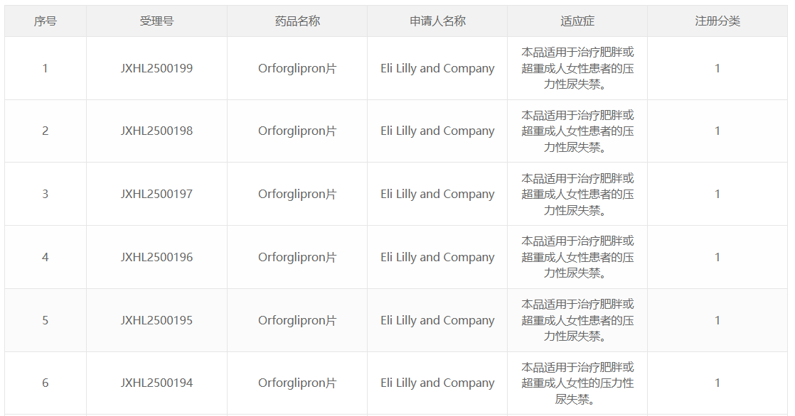 10 月 10 日,CDE 官网显示,礼来 Orforglipron 片的一项新适应症在国内获批临床,拟用于治疗肥胖或超重成人女性患者的压力性尿失禁。