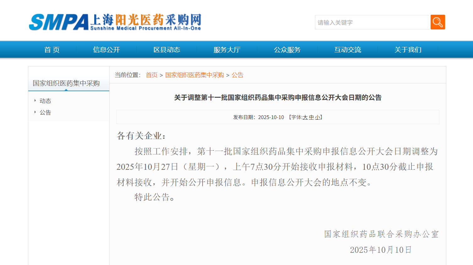 10月10日,国家组织药品联合采购办公室发布公告,第十一批集采开标时间调整为10月27日,原定为10月21日,地点仍然为上海市青浦区竹盈路340弄1号。