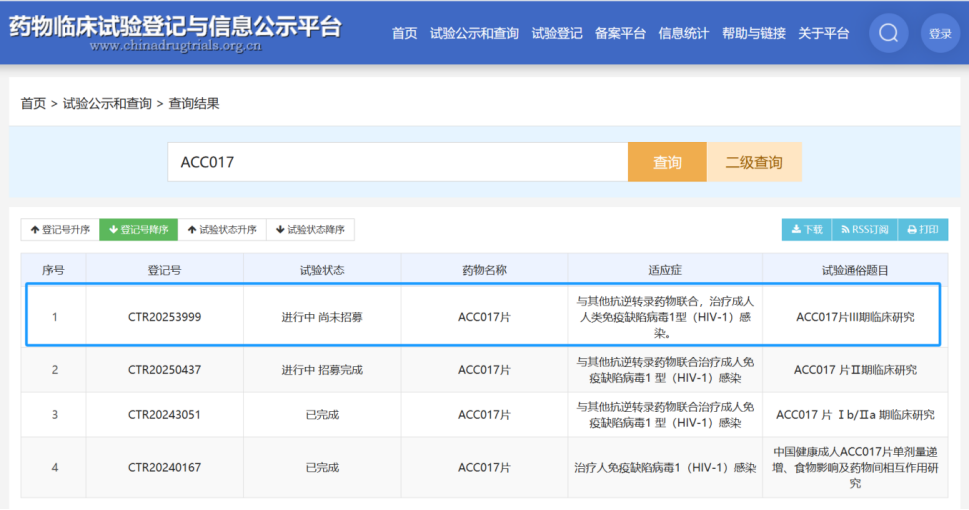10 月 10 日,药物临床试验登记与信息公示平台官网显示,艾迪药业集团新一代整合酶抑制剂 ACC017 启动 III 期临床,拟与其他抗逆转录药物联合,治疗成人人类免疫型缺陷病毒 1 型(HIV-1)感染。