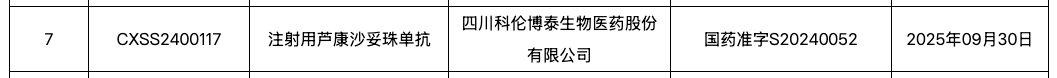 10 月 11 日,NMPA 官网显示,科伦博泰 TROP2 ADC 芦康沙妥珠单抗获批一项新适应症,用于治疗经表皮生长因子受体酪氨酸激酶抑制剂(EGFR-TKI)治疗后进展的 EGFR 突变局部晚期或转移性非小细胞肺癌 (NSCLC) 成人患者(受理号:CXSS2400117)。*如需获取 2025 年更多新药获批情报,扫描文末二维码添加小音,即可免费下载。