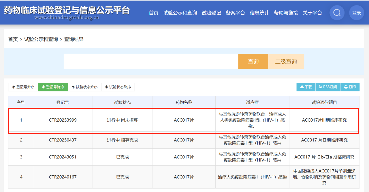这是一项中国多中心、双盲、随机、阳性(多替拉韦)对照研究,预计纳入660例参研者,旨在评估48周时ACC017相比于对照药组的病毒学有效性(HIV RNA载量<50 copies/mL参与者百分比),后续还将延伸至96周开放标签治疗。