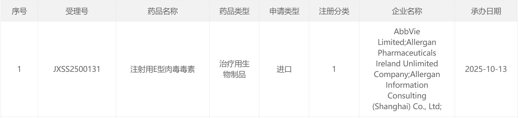 10 月 13 日,CDE 官网显示,艾伯维注射用 E 型肉毒毒素(TrenibotE)上市申请获受理,注册分类为 1 类。根据公开资料和临床试验进展,Insight 数据库推测适应症为中度至重度眉间纹。