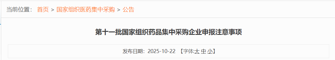 第十一批国家组织药品集中采购申报信息公开大会将于2025年10月27日进行。注意事项提醒如下: