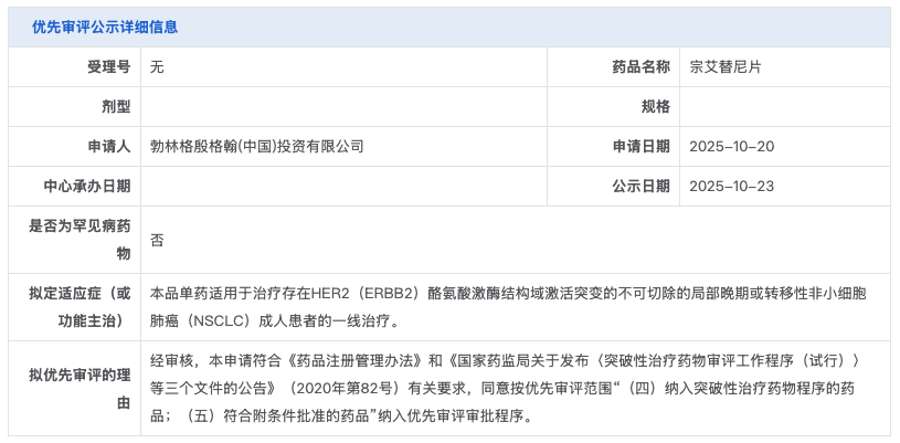10 月 23 日,CDE 官网显示,勃林格殷格翰的宗艾替尼片拟纳入优先审评品种,用于存在 HER2(ERBB2)酪氨酸激酶结构域激活突变的不可切除的局部晚期或转移性非小细胞肺癌(NSCLC)成人患者的一线治疗。