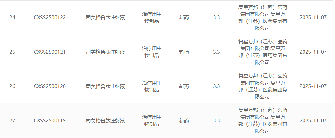 11 月 7 日,CDE 官网显示,复星万邦的司美格鲁肽注射液上市申请获得受理。根据该药的临床进度推测,本次申报的适应症可能为 2 型糖尿病。根据 Insight 数据库,这是第 9 款申报上市的国产司美格鲁肽。