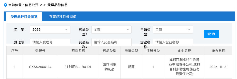 11 月 21 日,CDE 官网显示,百利天恒注射用 BL-B01D1 上市申请获受理。根据招股书和临床试验进展,Insight 数据库推测用于治疗鼻咽癌。此前,该适应症已被药监局纳入优先审评。