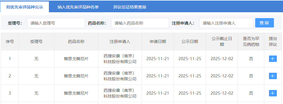 11 月 25 日,CDE 官网显示,药捷安康 1 类新药替恩戈替尼片拟纳入优先审评,用于既往至少接受过一种系统性治疗和 FGFR 抑制剂治疗的晚期、转移性或不可手术切除的胆管癌成人患者的治疗。