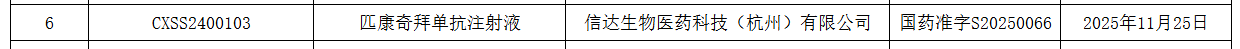11 月 28 日,NMPA 官网显示,信达生物的 1 类新药匹康奇拜单抗注射液(IBI112)获批上市,治疗中重度斑块状银屑病(受理号:CXSS2400103)。