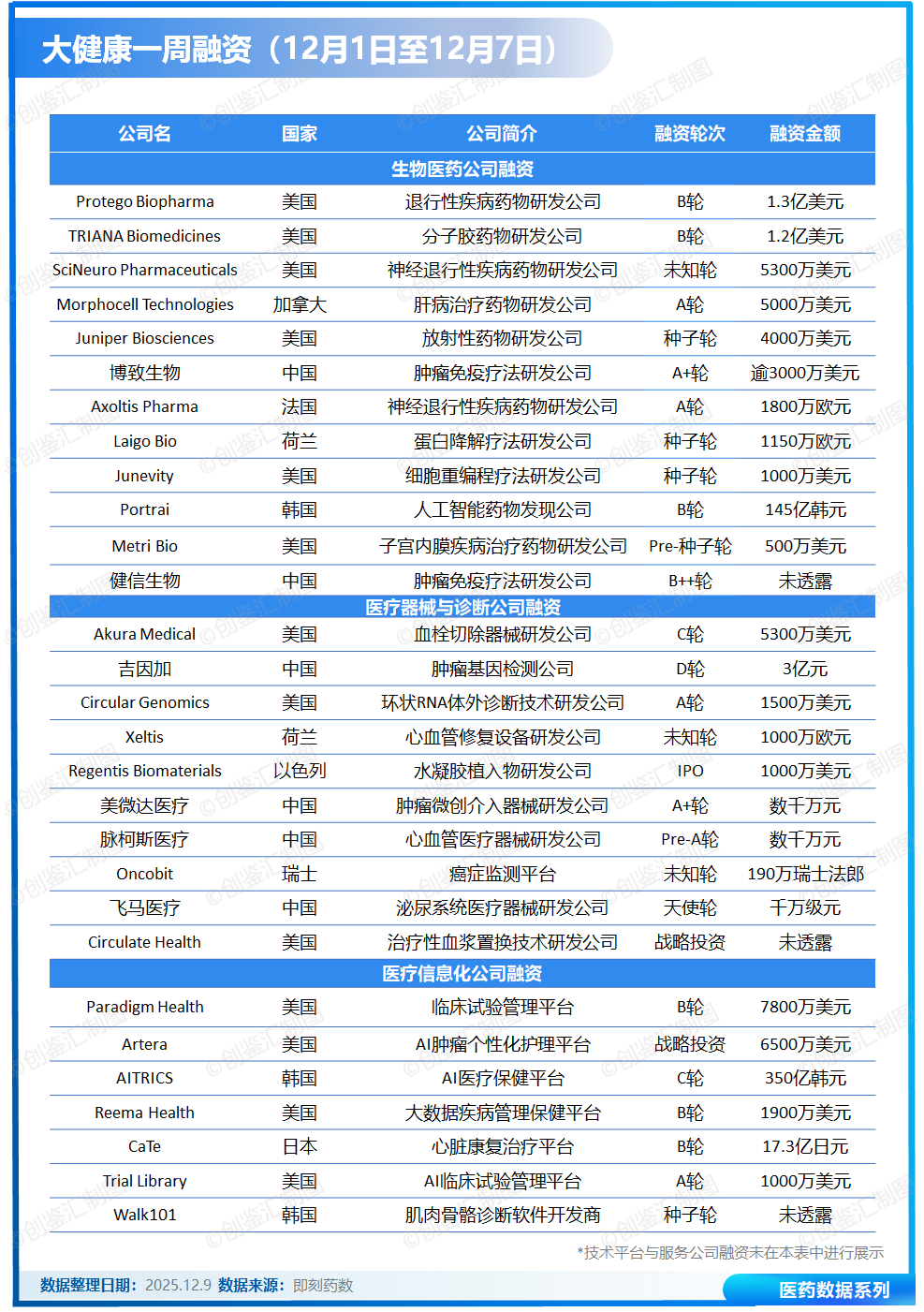 据创鉴汇不完全统计,上周(12月1日至12月7日),全球大健康领域共披露融资事件34起,总金额约9.6亿美元。
