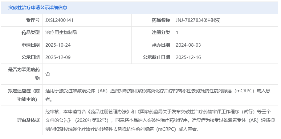 12 月 9 日,CDE 官网显示,强生的 1 类新药 JNJ-78278343 注射液拟纳入突破性治疗品种,适应症为用于接受过雄激素受体(AR)通路抑制剂和紫杉烷类化疗治疗的转移性去势抵抗性前列腺癌(mCRPC)成人患者。根据 Insight 数据库,该药是全球首个且目前唯一进入 Ⅲ 期临床阶段的 KLK2 靶向药物。