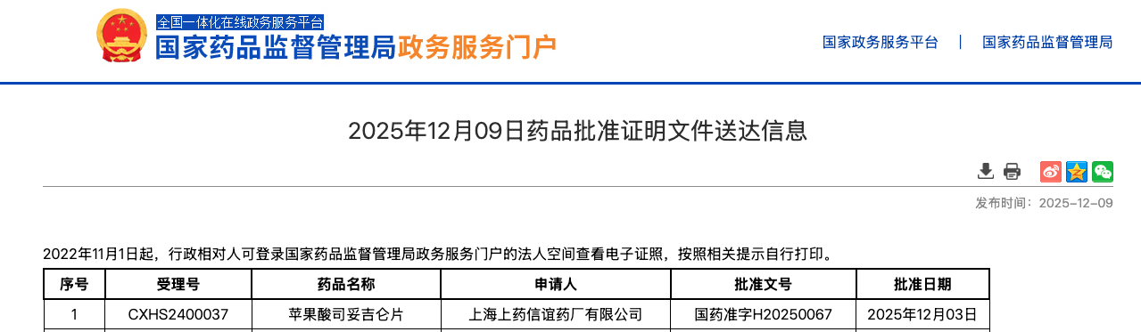 12 月 9 日,NMPA 官网显示,上海医药 1 类新药司妥吉仑(研发代号:SPH3127)获批上市,用于原发性高血压患者(受理号:CXHS2400037)。