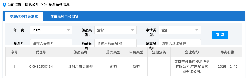 12 月 12 日,CDE 官网显示,由南京宁丹新药和广东星昊药业共同申报的 1 类新药注射用洛贝米柳(Y-3)新药上市许可申请(NDA)获受理。这是一种用于急性缺血性卒中的脑细胞保护剂。