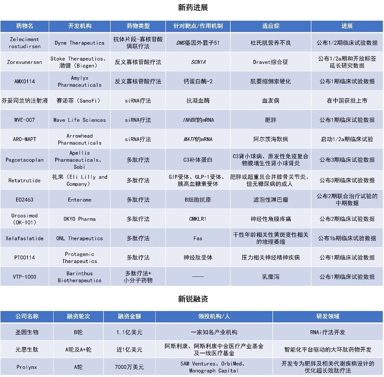 近期,全球多肽和寡核苷酸(TIDES)领域迎来系列进展。礼来(Eli Lilly and Company)公布了其潜在“first-in-class”三靶点减重多肽疗法retatrutide的积极3期临床试验结果,患者治疗68周后,平均减重最高达28.7%。赛诺菲(Sanofi)宣布其用于治疗血友病的小干扰RNA(siRNA)疗法芬妥司兰钠注射液(商品名:赛菲因)已正式获得中国国家药品监督管理局(NMPA)批准上市。Enterome公司基于肿瘤肽的免疫疗法EO2463联用利妥昔单抗一线治疗低肿瘤负荷滤泡性淋巴瘤患者,在一项2期临床试验中的客观缓解率(ORR)达100%。本文将节选其中部分重要进展做简单介绍,仅供读者参阅。