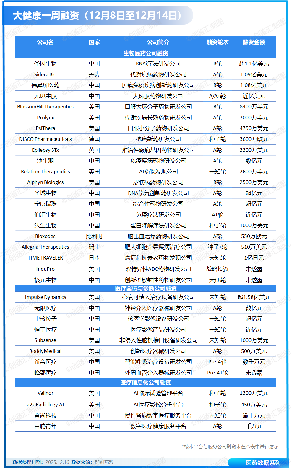 据创鉴汇不完全统计,上周(12月8日至12月14日),全球大健康领域共披露融资事件39起,总金额超12.3亿美元。