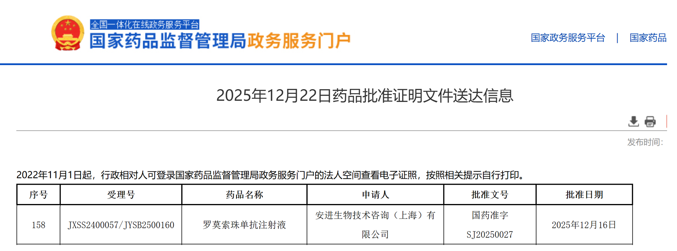12月22日,国家药监局(NMPA)官网显示,优时比(UCB)/安进(Amgen)的罗莫索珠单抗(Romosozumab)获批上市,用于治疗骨质疏松症。