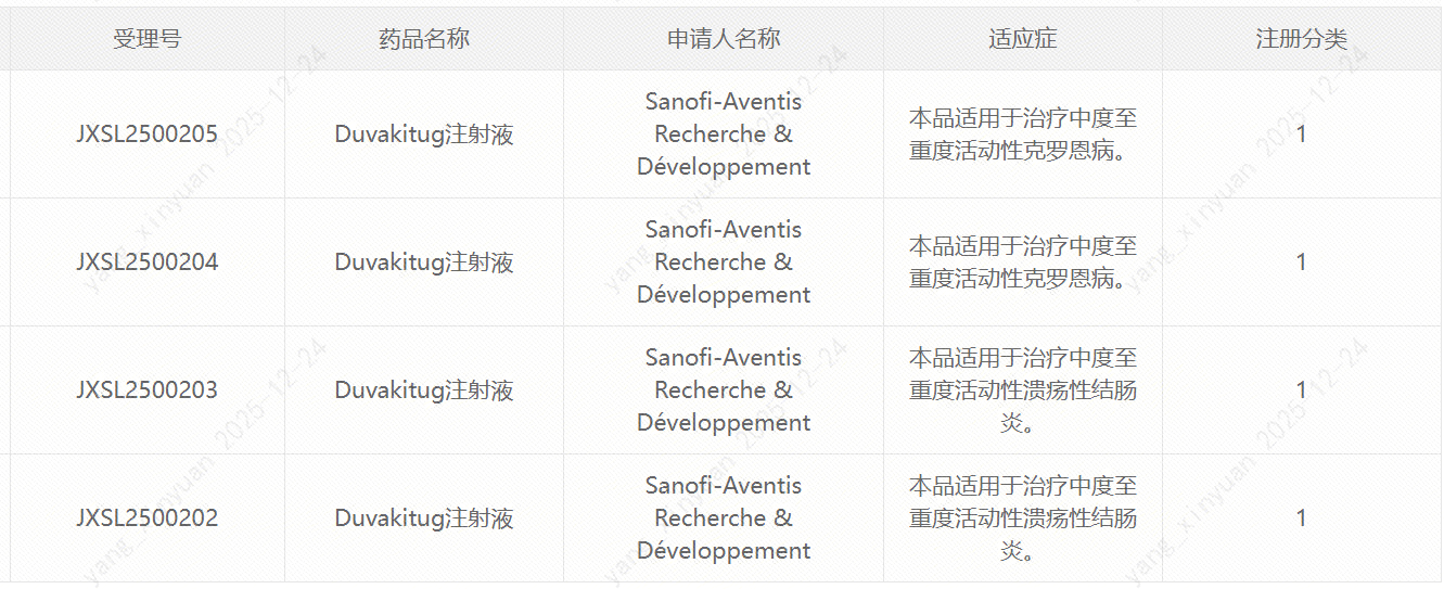 12月23日,中国国家药监局药品审评中心(CDE)官网公示显示,赛诺菲(Sanofi)申报的1类新药duvakitug注射液获批临床,拟开发治疗中度至重度活动性克罗恩病(CD)、中度至重度活动性溃疡性结肠炎(UC)。公开资料显示,这是一款TL1A靶向单抗。赛诺菲与梯瓦(Teva Pharmaceuticals)在2023年达成合作,共同开发并商业化duvakitug,用于治疗UC和CD。赛诺菲主导3期临床开发项目。