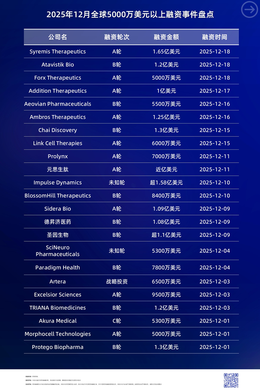限于篇幅,本文无法对所有公司进行介绍,如需获取完整信息,请参阅《2025年12月全球5000万美元以上融资事件盘点》(详见下图)。