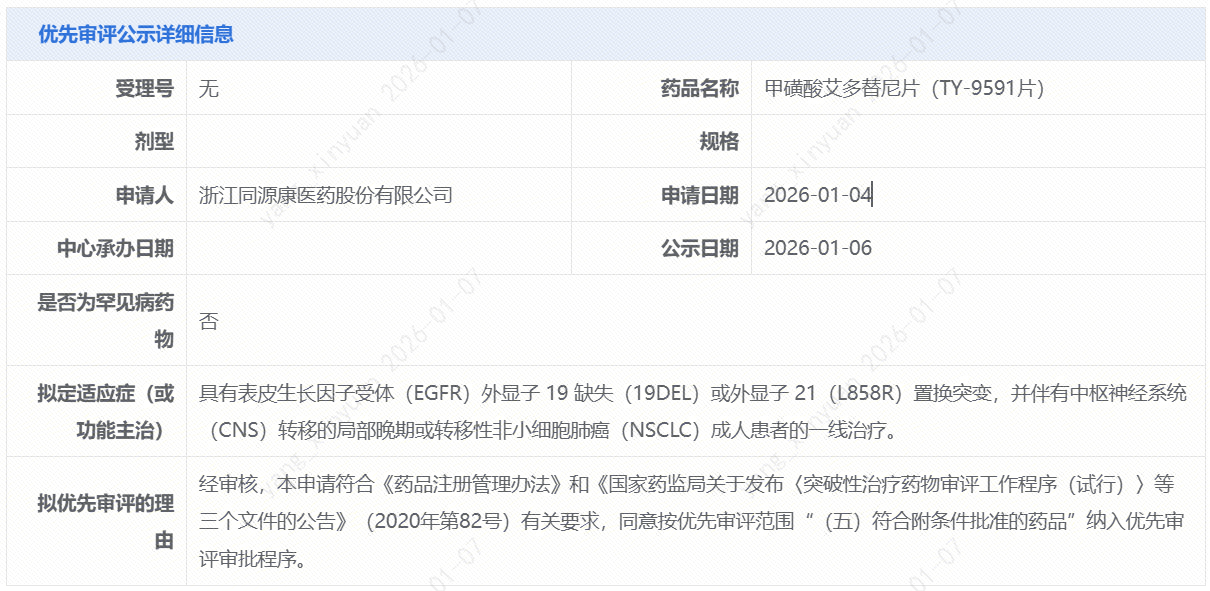 1月6日,中国国家药监局药品审评中心(CDE)官网公示,同源康医药在研的1类新药甲磺酸艾多替尼片(TY-9591片)拟纳入优先审评,适应症为:具有表皮生长因子受体(EGFR)外显子19缺失(19DEL)或外显子21(L858R)置换突变,并伴有中枢神经系统(CNS)转移的局部晚期或转移性非小细胞肺癌(NSCLC)成人患者的一线治疗。公开资料显示,这是一款适用于非小细胞肺癌脑转移的第三代EGFR-TKI候选药物。
