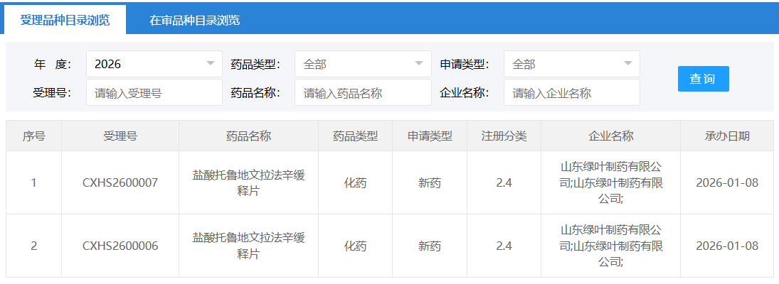 1 月 8 日,CDE 官网显示,绿叶制药递交的盐酸托鲁地文拉法辛缓释片新适应症上市申请获得受理。根据该药的研究进度,Insight 数据库推测,本次申报的适应症可能为用于治疗广泛性焦虑障碍。此前,该药已在国内获批用于治疗抑郁症,商品名为若欣林®。