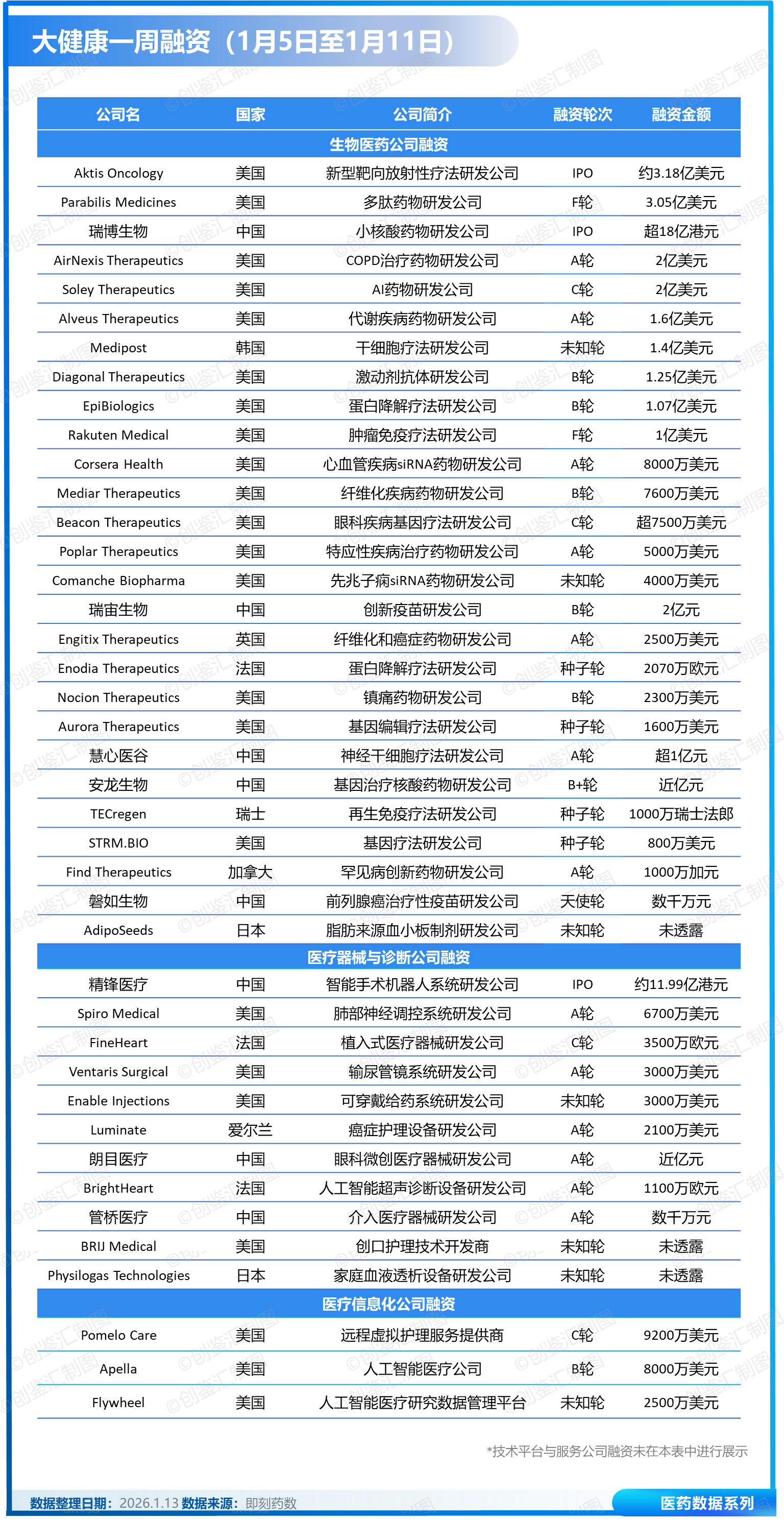据创鉴汇不完全统计,2026年开年第一周(1月5日至1月11日),全球大健康领域共披露融资事件44起,总金额突破30亿美元。单笔金额超亿美元的大额融资达11起,增长显著。创新药领跑融资,聚焦RNAi、CGT、多肽及蛋白降解疗法等领域。