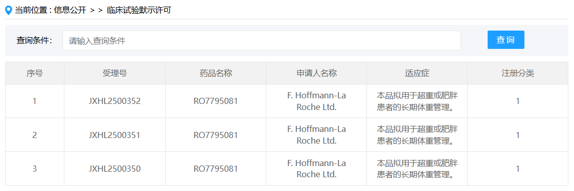 1 月 20 日,CDE 官网显示,罗氏申报的 1 类新药 RO7795081 国内首次获批临床,拟开发用于超重或肥胖患者的长期体重管理。