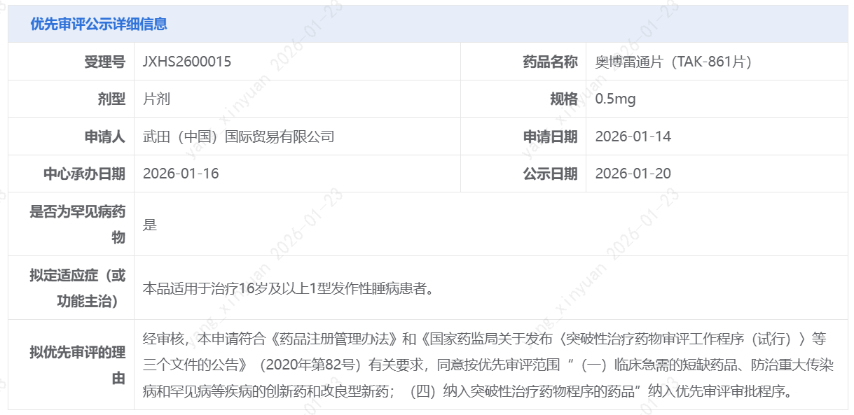 中国国家药监局药品审评中心(CDE)官网近日公示显示,武田(Takeda)申报的1类新药奥博雷通片(oveporexton,TAK-861片)的上市申请拟纳入优先审评,适用于治疗16岁及以上1型发作性睡病(NT1)患者。公开资料显示,这是武田研发的一款口服选择性食欲素2型受体(OX2R)激动剂。该产品针对NT1适应症的两项3期关键性研究已经达到所有主要和次要终点。